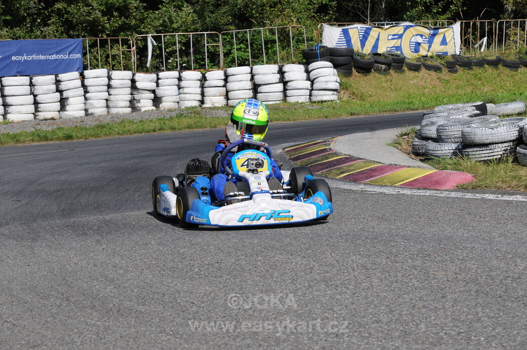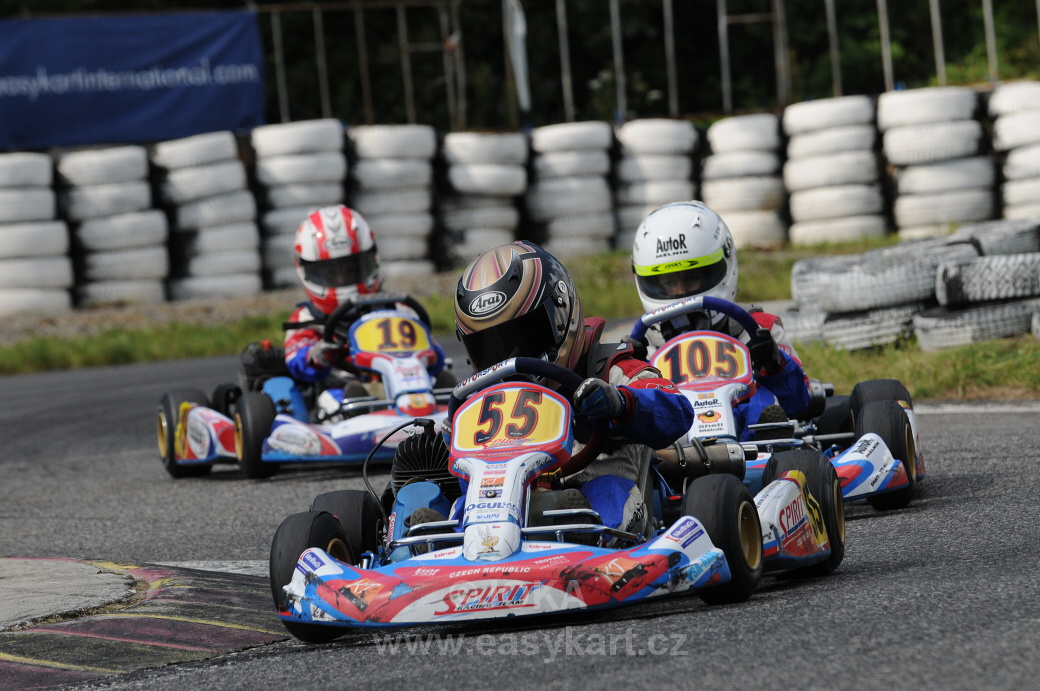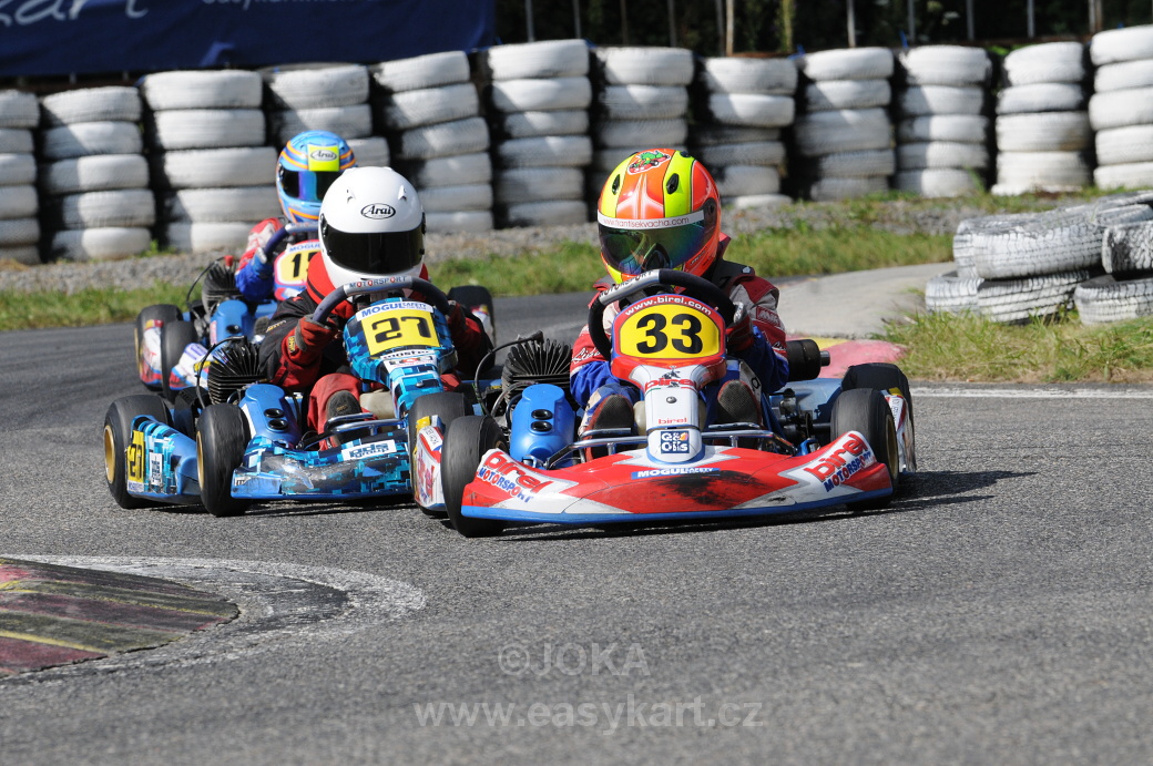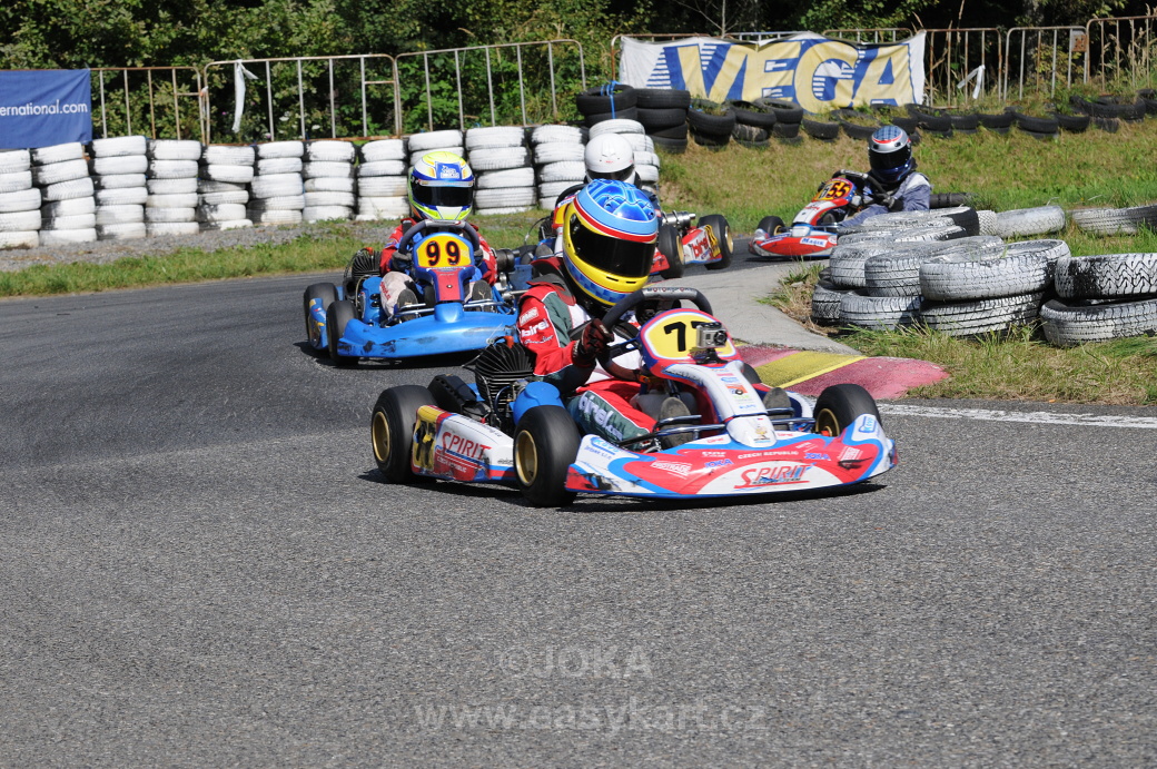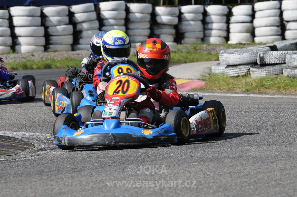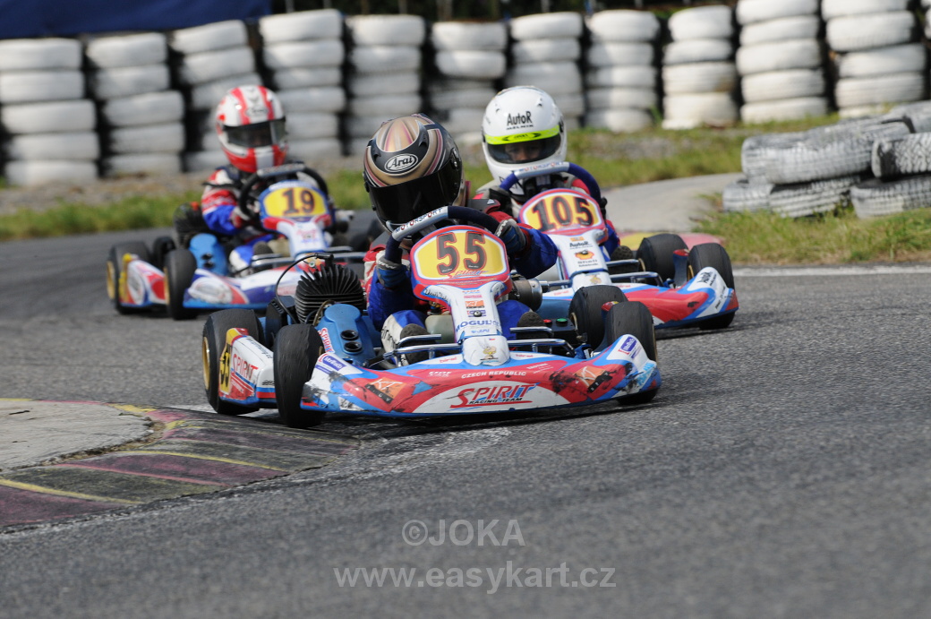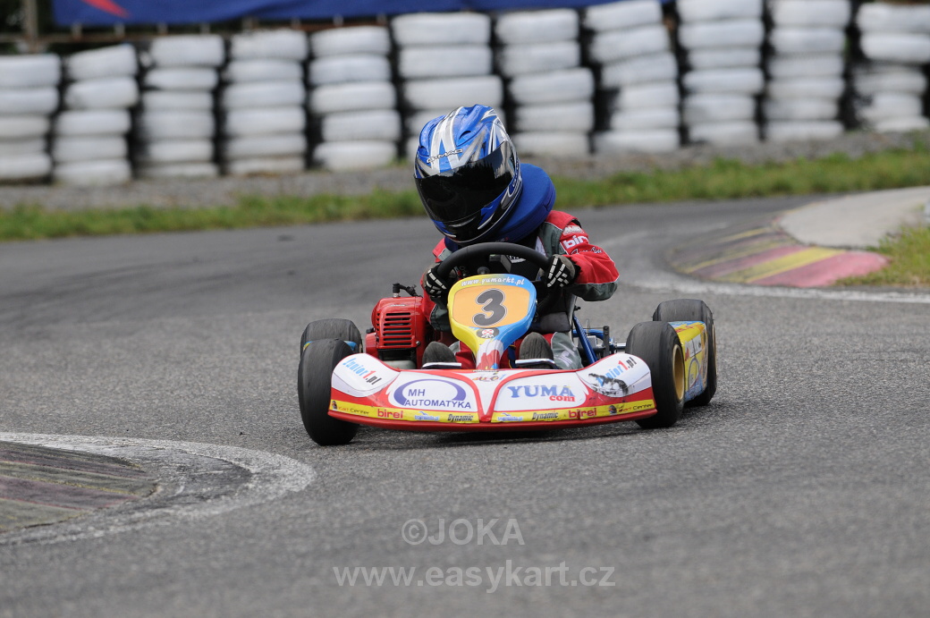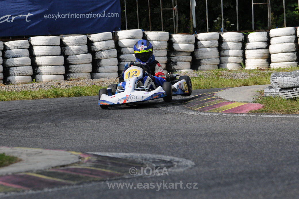 EASY 60 Při pohledu na celkové pořadí před píseckým závodem by se dal očekávat největší souboj o celkové prvenství mezi Dominikem Javůrkem a Stanislavem Garsteckim. Vše bylo, ale úplně jinak! Zatímco ve volných trénincích byli oba na špici, od kvalifikace se jim vůbec nedařilo. Dominik se trápil někde kolem 12. místa a Stanislav ani jednu bodovanou jízdu nedokončil pro technické závady. Na druhou stranu jsme ovšem na předních pozicích měli možnost sledovat jezdce, kteří jasně dávají najevo, že v budoucnu chtějí být v EASY 60 rozhodně vidět. Jakub Roubíček patří mezi „služebně“ nejmladší, přesto bojoval o celkové vítězství. Dokázal si spočítat, že druhé místo v odpolední jízdě mu na zlatý věnec stačí a zbytečně neriskoval při předjíždění. Zdeněk Tlachač jede také velice rychle, chybí mu jen více zkušeností. Snad právě to ho vedlo k tomu, že v první jízdě se svou chybou dostal do kolize, která jej připravila o šance na celkové umístění. Po malé pauze se na stupně vítězů vrátil vyzrálou jízdou Lukáš Podobský. Samostatnou kapitolou byl výkon „píseckého“ Alexe Legnara, který si povzbuzován místními „tifosi“ dojel pro zelený věnec. O množství jeho fanoušků pak něco napovídaly kontejnery plné krabic od pizzy. Z dalších je třeba určitě pochválit Václava Šafáře, Ondru Nigrina, Františka Váchu a nesmíme zapomenout ani na vždy rychlé polské jezdce. Bodované jízdy byly opět plné velice pěkných soubojů, a na dodržování pravidel premiérově v českých motokárových závodech dohlížely onboard kamery. Vyhodnocení záznamů pak pomohlo sportovním komisařům při řešení kolize po startu, za kterou byli dva jezdci vyšetřováni. Po dojetí obou jízd se z celkového vítězství mohl radovat Jakub Roubíček, před Lukášem Podobským a Alexem Legnarem.