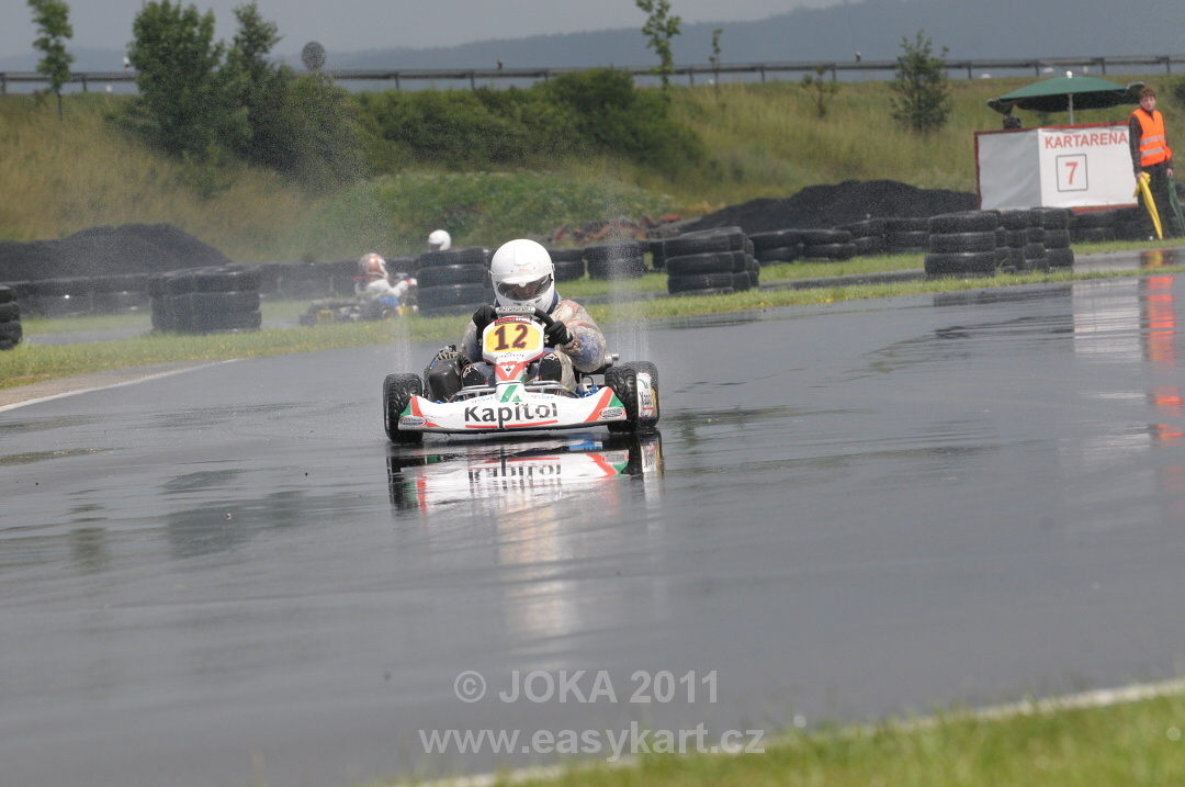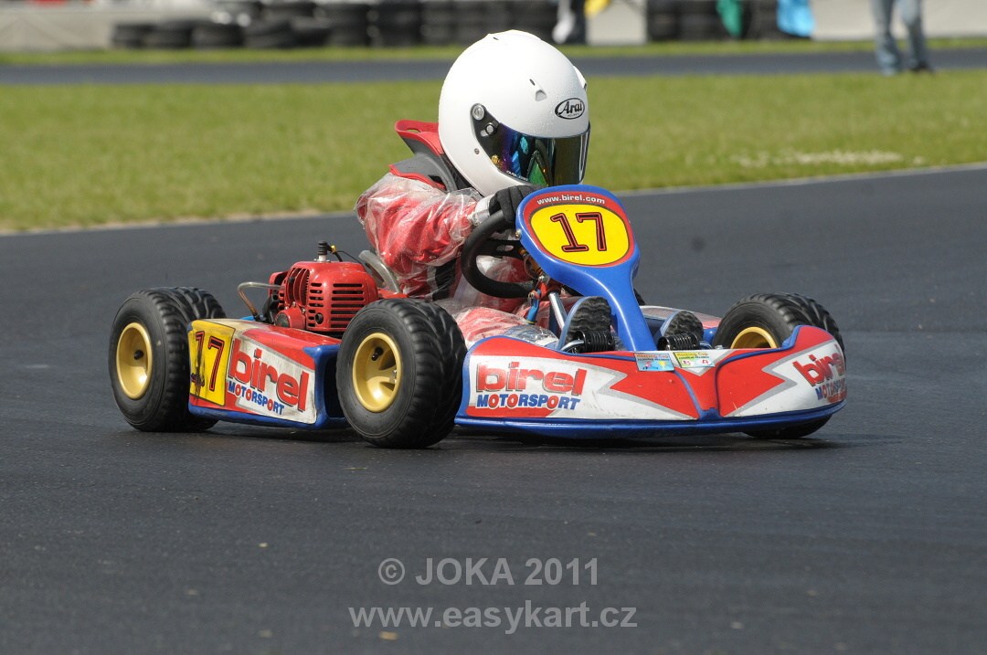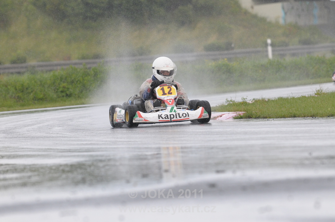 První nedělní bodovaná jízda Easy 50 „A“ poznamenaná hustým deštěm se odehrála ve znamení urputného souboje Škorpík – Salakhutdinov. Na čelo se sice nejprve skvěle probojoval Matěj Kácovský, ale tempo již zmíněného česko-ruského dua neudržel. Přesto je jeho třetí místo v cíli určitě úspěchem. Oba jezdci na špici si na mokrých gumách nedarovali ani centimetr tratě. Rus zajel nejrychlejší kolo, ale jeho soupeř dominoval ve zvolené stopě. Vzájemný souboj vyvrcholil na cílové rovině vítězstvím Škorpíka nad Salakhutdinovem snad jen o pověstný nárazník (řečeno slovy čísel o 0,048 vteřiny!). Také „béčko“ startovalo v 1. jízdě na mokrých gumách, i když déšť už polevil na síle. Zcela unikátní kousek předvedl na startu Jakub Uhlíř, kterému vlivem selhání techniky nevyšla kvalifikace. Z posledního místa na startu byl po první levé zatáčce na čele celého pole jezdců! Jenže krátce na to chyboval, dostal se do „hodin“, ze kterých odjel opět jako poslední a vydal se na stíhací jízdu. Šanci tak vycítil Martin Antoš, který dlouho vedl před Polákem Laskowskim. Jenže jako nůž máslem projížděla polem jezdců motokára již zmíněného Jakuba Uhlíře st. č.70. Ten však nutno dodat patří výkonnostně do skupiny A. V posledním kole Jakub nejprve předjel polského jezdce a po drobné chybě také Martina Antoše. Pak už mu nic nestálo v cestě za vítězstvím. Pořadí v cíli bylo tedy Uhlíř, Antoš a Laskowski.