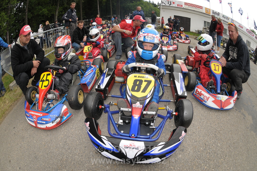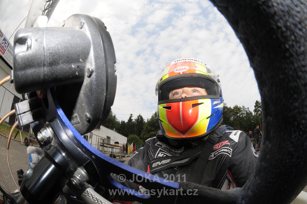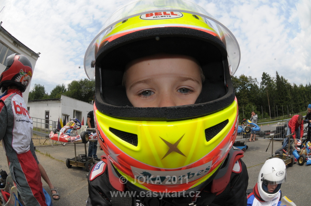 I v této třídě byla sobotní kvalifikace velmi vyrovnaná. Považte sami – v jedné vteřině bylo „naskládáno“ hned 8 jezdců. Z Itálie vyježděný Lukáš Podobský sice získal první místo na startu obou nedělních závodů, ale s náskokem neuvěřitelných 0,004 sekundy (!) před druhým Zdeňkem Tlachačem. Nejlepší kvalifikační trio uzavíral Jakub Roubíček, který tak udělal první důležitý krok v hodnocení třídy E60 Mladí. Na startu prvního nedělního bodovaného závodu měl velké problémy Tomáš Horský, který dohnal zbytek startovního pole během dvou zahřívacích kol a na poslední chvíli se zařadil zpět na svou 15. pozici z kvalifikace. Výborný start měl Lukáš Podobský a jediný, kdo s ním v té chvíli udržel krok byl Jakub Roubíček, který dokonce v prvním kole vedl. Poté se však propadl až na 7. pozici, nicméně pokračoval v atakování jezdců před sebou. Ve stejném stylu se propadl o 3 kola později také Podobský. Do hry tím vstoupil Zdeněk Tlachač, aby se však ohřál na výsluní první pozice pouhá dvě kola, než přepustil vedení výborně jedoucímu Dominiku Stříteskému, jenž startoval z osmé příčky. Jízda byla poznamenána také vzájemnou kolizí Jana Anstoszewského, Václava Šafáře a Zdeňka Tlachače. Nejvíce na ni doplatil posledně jmenovaný jezdec. Šafář nakonec uzavřel v pořadí první pětici jezdců v cíli. Zvítězil Stříteský s téměř 5 sekundovým náskokem před Polákem Antoszewským a Lukášem Podobským, který oslnil závěrečným sprintem. Čtvrté místo Jakuba Roubíčka znamenalo vítězství v „Mladých“. Ve stejném hodnocení byla druhá Nela Mičánková, která završila Top 10 celkového pořadí první bodované jízdy E60 a byla tak nejúspěšnější dívkou na písecké trati. Třetím „mladým“ v této klasifikaci byl Jáchym Galáš.Ani druhá nedělní bodovaná jízda třídy E60 se na startu neobešla bez problémů poté, co Adam Křivánek s č.14 a také Polák Adam Lalak nemohli nastartovat své motokáry. Lalak odstartoval dokonce jako poslední. To, co však odlišilo druhou jízdu od té dopolední bylo nasazení suchých pneumatik, neboť trať oschla a tak odpolední změna obutí byla nutností pro všechny týmy. Průběh závodu byl poměrně klidný až na jednu výjimku. O velké vzrušení se v 10 závodních kolech této jízdy opět postarali Zdeněk Tlachač a Lukáš Podobský. Celý závod jel Lukáš na čele zcela bezchybně. Osudové se mu stalo kolo poslední, kdy svedl se Zdeňkem nádherný souboj „side by side“, leč Zdeněk Tlachač byl ve finále tím úspěšnějším. Tlachač zajel v závěru také nejrychlejší kolo časem 0:59.479. Historie se ptát nebude, my však dodejme, že vyhrál o pouhých 0,103 sekundy. Třetí jel v podstatě systémem start-cíl Jakub Roubíček s č.101 a potvrdil roli jasného celkového favorita ve třídě Mladí. Stejně jako dopoledne byli i ve 2. jízdě za ním v tomto hodnocení Nela Mičánková a Jáchym Galáš. Celkově si tedy z Písku součtem obou jízd odvezl vítězství Lukáš Podobský před Dominikem Stříteským a Zdeňkem Tlachačem. V průběžném pořadí E60 nadále vede Václav Šafář, následovaný Zdeňkem Tlachačem a Tomášem Horským. Za nimi následuje dvojice Podobský-Stříteský se shodným počtem 101 bodů.Další podnik MČR 2011v kartingu je za námi a tak nezbývá než doufat, že ten následující na okruhu v Sosnové v polovině srpna přinese všem jezdcům a příznivcům třídy Easykart konečně typicky letní počasí a teploty.
