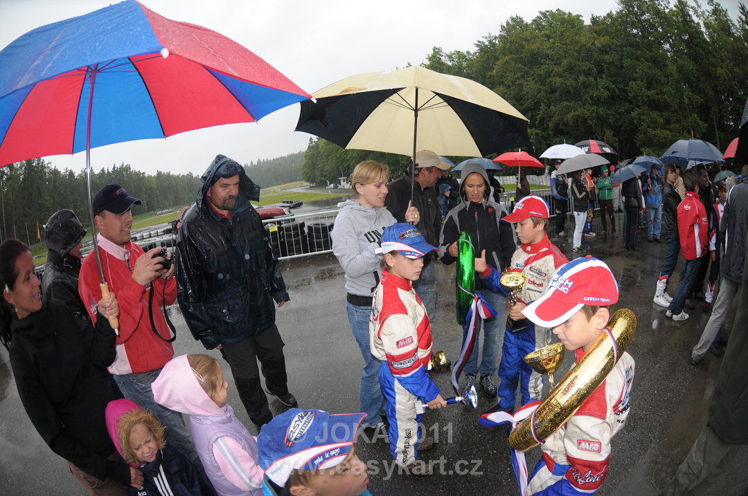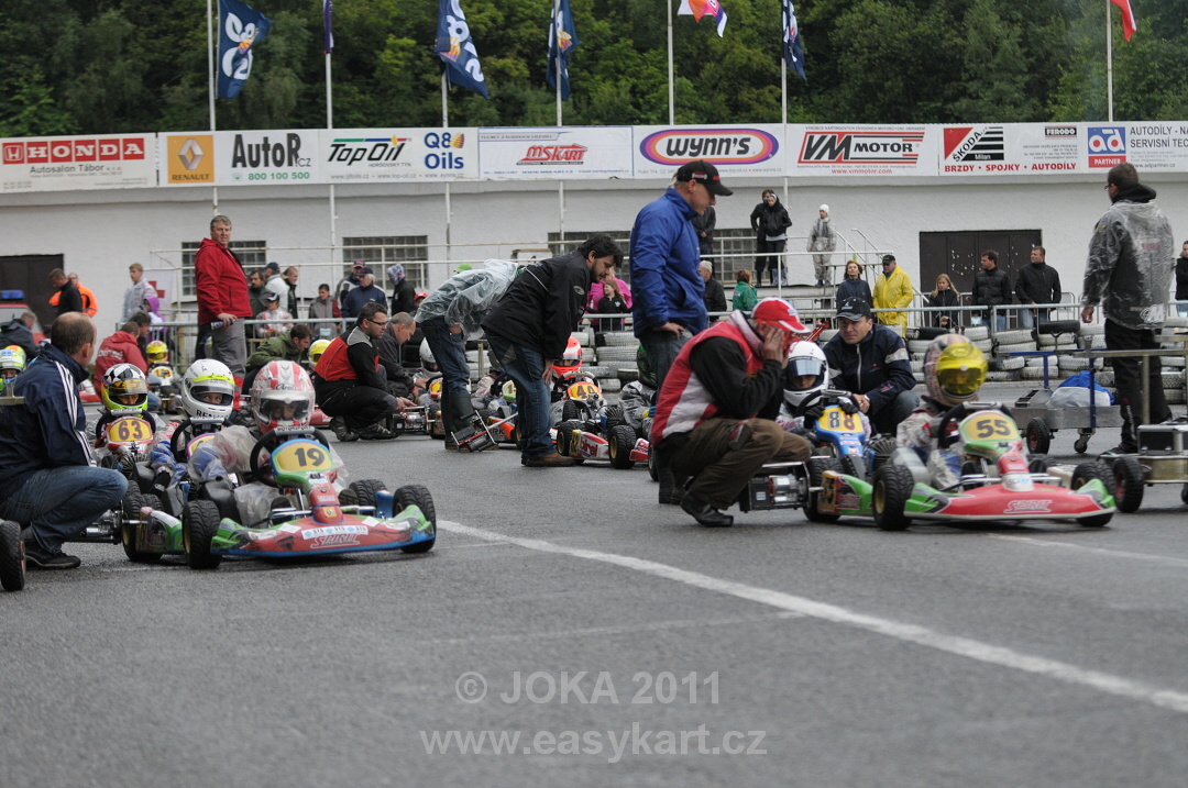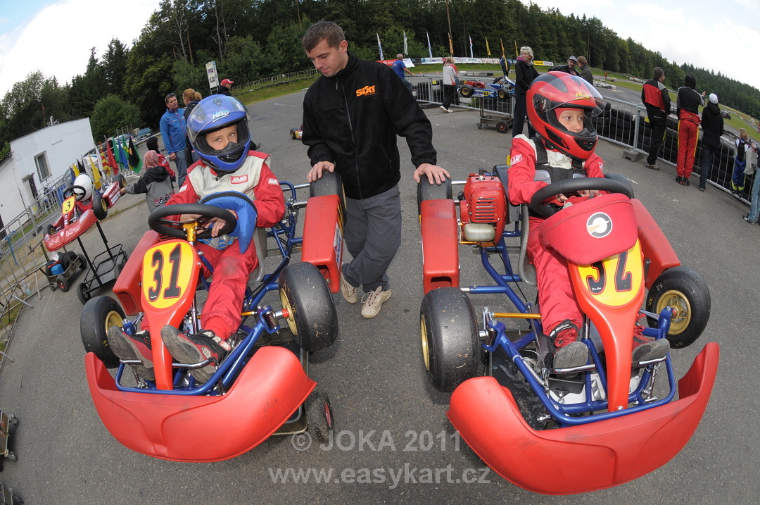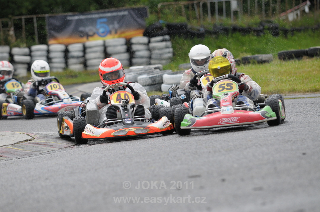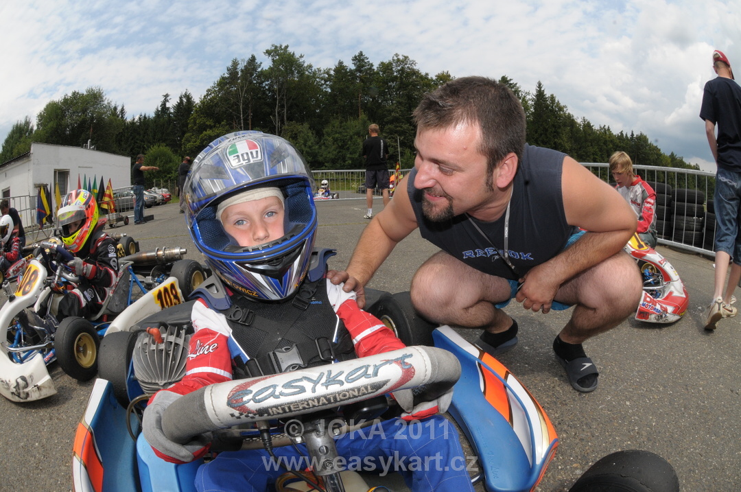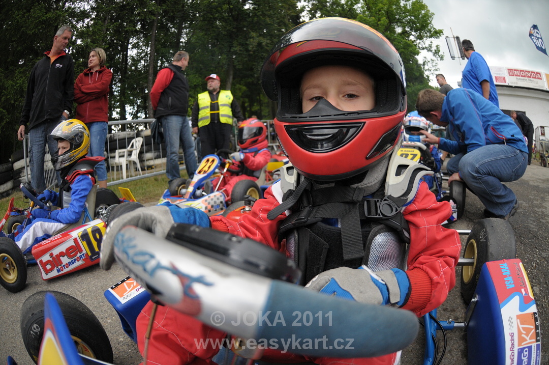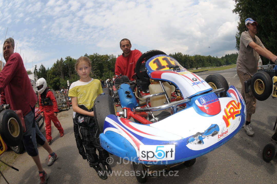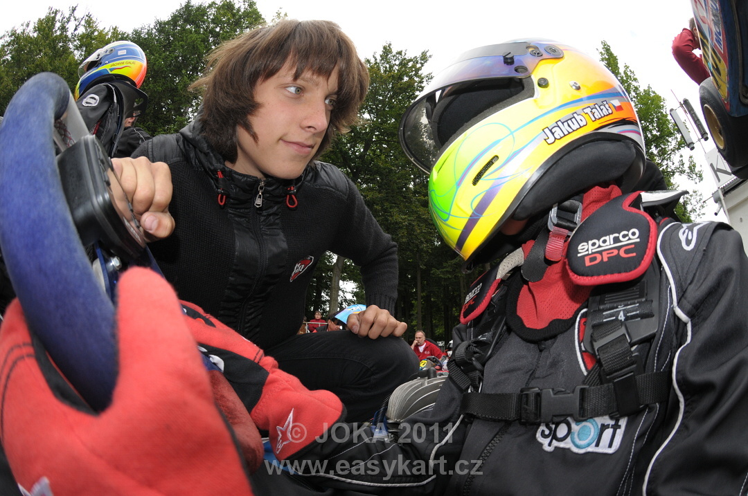 Sobotní kvalifikace byla ve znamení tria Salakhutdinov, Wagenknecht a Kácovský, které obsadilo v tomto pořadí první tři místa na startu nedělních bodovaných jízd. Nejlepší dívkou v měřeném tréninku byla Roxana Landová na 5. místě, která tak ukázala záda zkušeným jezdcům, jakými jsou Filip Škorpík či Vincent Gianquintieri. Překvapením bylo „pouze“ 12. místo Rusa Sergeye Sonkyna, dosavadního lídra průběžného pořadí, který ztrácel v kvalifikaci na špičku pole více jak 3,5 vteřiny! První místo na startu skupiny „B“ si vyjela Rozálie Landová před Štěpánem Galášem časem lepším o pouhé dvě tisíciny vteřiny. V neděli se nad závodištěm zatáhla mračna, což jednoznačně vedlo při první bodované jízdě k nasazení „mokrých“ pneumatik s hlubokým dezénem. Déšť na sebe nenechal dlouho čekat. Start E50 „A“ s následnou vlásenkou v nejvyšším místě okruhu vyšel zcela bez problémů pro většinu jezdců. Tím, kdo zpočátku jasně udával tempo byl Jan Wagenknecht, který po skvělém startu nasadil ostré tempo. Během několika kol si vytvořil dostatečný odstup před Salakhutdinovem, neboť jezdil o vteřinu rychleji, nežli ruský jezdec. Jenže největší nebezpečí pro Wagenknechta nebyl Salakhutdinov, ale dravě se dopředu posouvající Filip Škorpík. Z osmého místa na startu se během 4 kol dostal na druhou pozici a v posledním kole úspěšně zaútočil i na vedoucího Wagenknechta. V cíli bylo tedy pořadí Škorpík, Wagenknecht a Salakhutdinov. Ve skupině „B“ se v první závodní jízdě nepovedl start Borysi Chorazymu z Polska, který zůstal na startu pro technickou závadu své káry a „ulitý“ start se v případě dalšího Poláka Laskowského proměnil v 10sekundovou penalizaci. Rozálie Landová od startu „tlačila na pilu“ a držela si odstup od druhého Štěpána Galáše. O třetí místo sváděli tuhý boj Maciel Banas a Petr Pospíšil. Prvně jmenovaný byl nakonec úspěšnější a v posledním kole si Polák dokonce vyšlápl i na Galáše, který mu musel přenechat konečné 2. místo za vítěznou Landovou. Ta však o své vítězství málem přišla po jezdecké chybě v poslední zatáčce před cílem a z velkého náskoku zbylo v cíli jen 0,3 vteřiny od Banase. Závěr jako z hororu! Druhá bodovaná jízda E50 „A“ byla další ukázkou současné dominance Filipa Škorpíka. Po startu sice sváděli souboj Salakhutdinov, Wagenknecht a skvěle startující Roxana Landová, ale od 3.kola již nebylo co řešit. Nejprve chyboval před cílem Salakhutdinov, propadl se i Wagenknecht a nakonec neodolala tlaku Škorpíka ani dobře jedoucí Landová. V cili byl tedy s rekordním časem na kolo 1:14.714 první Filip Škorpík, který celkově třídu E50 v Písku vyhrál a s dalšími 50 body se posunul do čela průběžného pořadí. Druhá dojela Landová, která skončilka nakonec součtem bodů z obou jízd celkově na 4. místě. Bronzovou příčku obsadil v druhé jízdě Salakhutdinov, který se mohl nakonec radovat z celkově 3. místa, druhý byl hodnocen celkově Wagenknecht. Jezdci ve skupině B sice v druhé bodované jízdě bez deště dobře odstartovali, ale problémy přišly v následné vlásence, kde mělo několik jezdců vzájemnou kolizi. Zajímavostí bylo také rozdílné nasazení pneumatik u jednotlivých jezdců (pouze pět motokár na mokrých pneumatikách), které oprávněně vyvolalo diskuze v depu nad platným ipravidly a Ročenkou 2011. Z nasazení mokrých pneumatik nejvíce profitoval Polák Borys Chorazy se st. č. 6. V závěru totiž přišla vydatná dešťová sprcha, která znamenala vyvěšení červeno-žlutých praporů (kluzká trať). I přes vlajkové upozornění měli jezdci na vodou zalité trati plně ruce práce, o čemž by mohla vyprávět například Rozálie Landová, která předvedla několik bravůrně zvládnutých „piruet“. V cíli 2. jízdy E50 „B“ bylo pořadí: Chorazy, Galáš a další reprezentant Polska Kacper Rozenkovski. Již podruhé za sebou ukázali nejmladší závodníci svoje umění za volantem při nelehkých klimatických podmínkách. A to se do budoucna počítá…