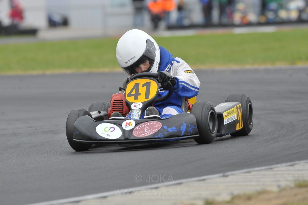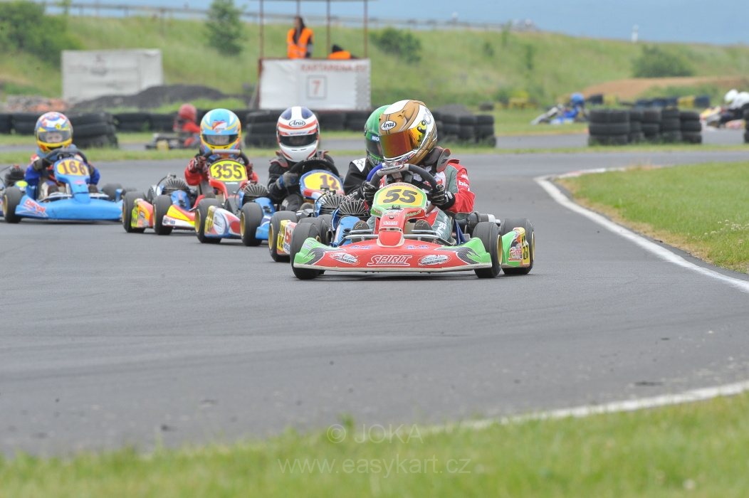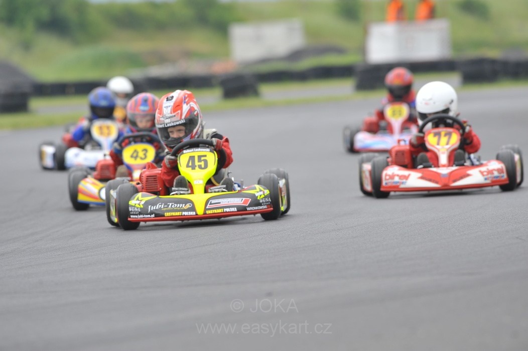 Již dubnová školička ve Vysokém Mýtě, povinná pro děti do 10 let, představila nové tváře ve třídě Easy 50. Naopak vzhledem k tolik diskutovaných pravidlům v letošní ročence CIK-FIA se v našem domácím šampionátu Easy 50 neobjevili ruští závodníci týmu Bear Racing (Sonkin, Ischenko, Savčuk či Salakhutdinov).  Někteří jezdci se přesunuli do „ligy starších“ – třídy Easykart 60 nebo jiných kategorií. Příkladem mohou být Filip Škorpík, Jan Wagenknecht, ale také sestry Landovy, Matěj Kácovský nebo „VINI“ alias Vincent Gianquintieri. Třída Easy 50 tak přes zimu prošla generační obměnou a pomyslné žezlo kartingových elévů začínají v rukou svírat příkladně Martin Antoš, Jiří Bečička a další.  O to více bude letos třída Easy 50 zajímavější, což jasně ukázal už první závod v Chebu. Z druhého závodu KC rozjetí Antoš s Bečičkou dali jasně najevo, kdo bude v Chebu hrát v Easy 50 prim. O týden dřív si vychutnal vítězství na Ypsilonce Martin Antoš s již tradičním číslem 53 a byl na stejné trati při chuti i na prvním „mistráku“. Jiří Bečička si to ale nechtěl nechat líbit a kontroval nejlepším časem v sobotním  4. tréninku a Warm-upu. Antoš si zase pro sebe ukořistil „měřák“. Ale posuďte vzájemný rozdíl na jedno kolo – pouhých 0,034 sekundy! Na pořádný souboj bylo tedy zaděláno. Nedělním prvním bodovaným jízdám přálo také počasí. Teplotu okolo 13°C doplňovalo sucho a téměř bezvětří. Od západu se však k okruhu pomalu blížila pořádná mračna, což potvrzovaly také údaje z meteostanic jednotlivých týmů. Po tradičně pevném startu šel do čela Jiří Bečičika s č. 11, kterého hned pronásledovali Antoš, Kucharski a Jan Holman. Ale již v prvním kole se na čelo dostal Antoš před Bečičku. Drobná kolize poslala na chvost startovního pole Adama Holmana a Jakuba Mičánka. Mezitím na Bečičku úspěšně zaútočil Polák Kucharski a udržel si 2. místo až do cíle první bodované jízdy. Pole vedené neohroženě Martinem Antošem se poté poměrně roztáhlo a uklidnilo. Malý výlet mimo trať si dovolil Matěj Matuška, ale pokračoval dál. Suverénní vítězství předvedl Antoš s náskokem celé cílové roviny před Antoni Kucharskim , Bečičkou a Maksymilianem Kucharskim . Avšak po čtyřech 10sec. penalizacích za „ulití“ na startu bylo nakonec pořadí 1. jízdy: Antoš, Bečička a Kucharczyk