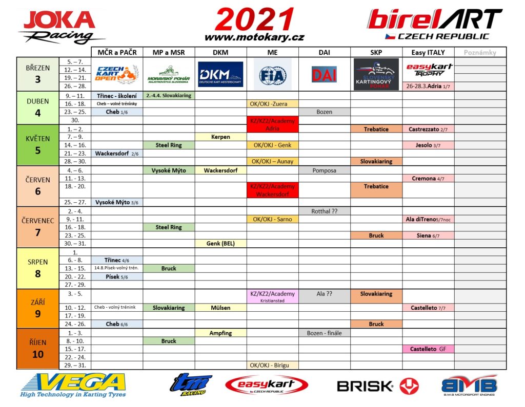Termínový kalendář motokárových závodů 2021 tak, jak  ho naplánovali jednotliví pořadatelé na začátku roku. Kalendář ve formátu pro tisk je zde.