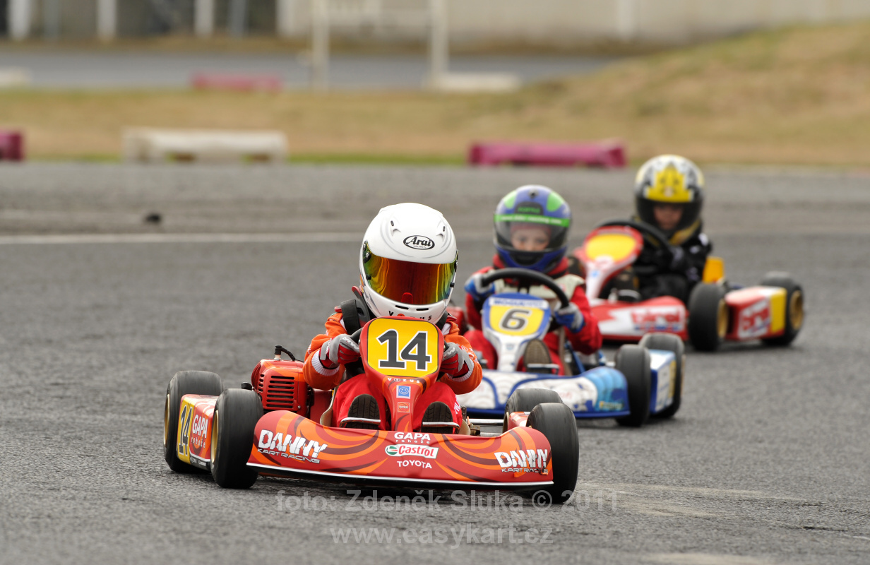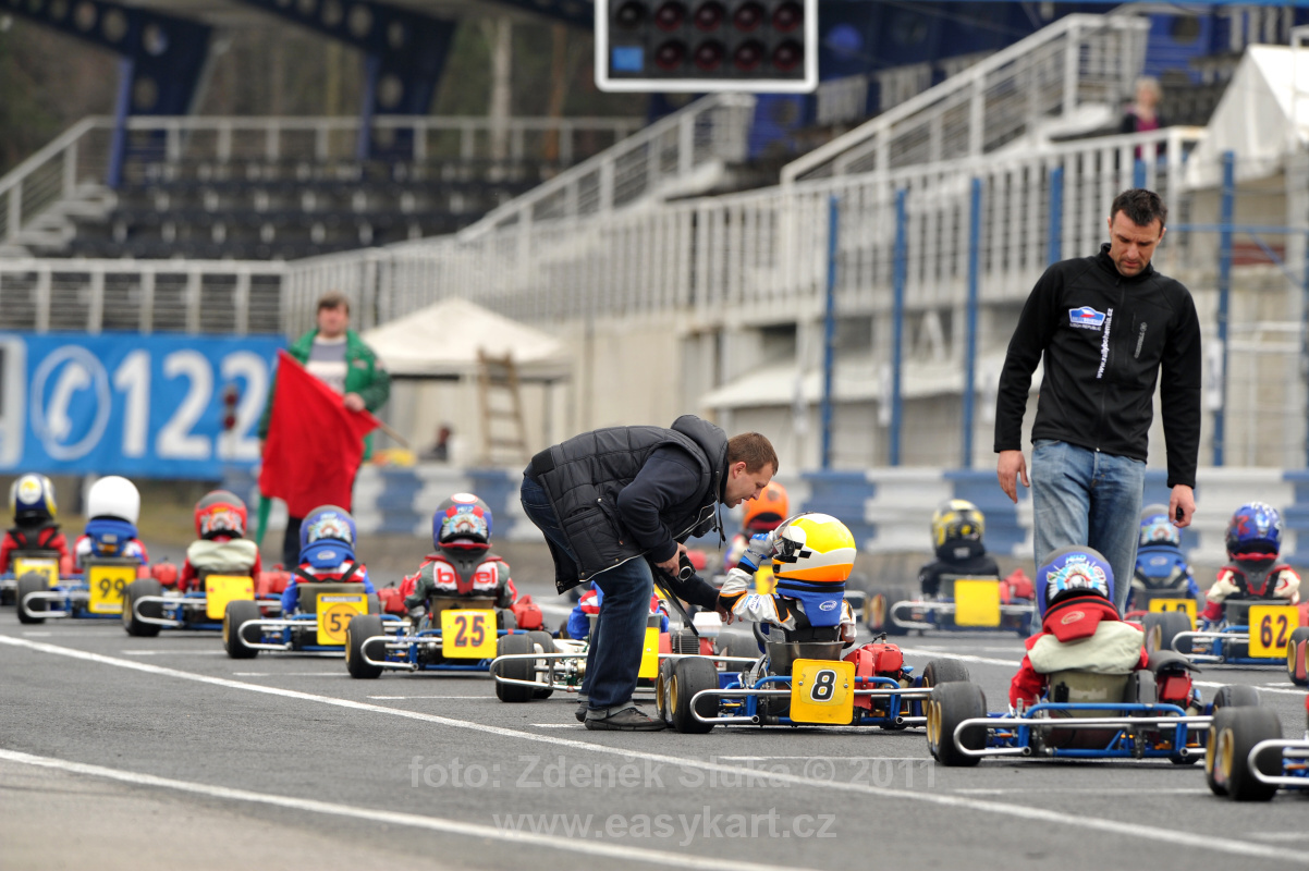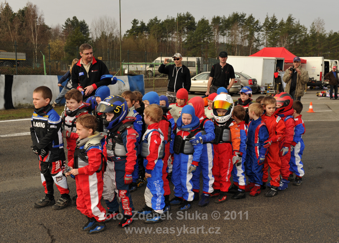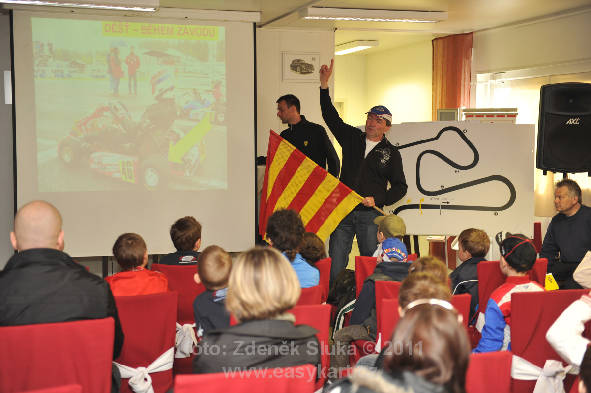 tento víkend se na okruhu v Sosnové konalo pravidelné školení jezdců, které je v podstatě oficiálním zahájením české motokárové sezóny. Školení je pro jezdce do 10-ti let od letoška povinnou podmínkou získání licence a účastnili se ho samozřejmě zejména budoucí naděje motokárového sportu ve věku od 5 do 10 let. Tento ročník byl zřejmě rekordní co do počtu účastníků, kterých bylo téměř 70 a také v počtu slečen ve startovním poli. Nutno poznamenat, že k tomuto stavu značně přispěl známý český zpěvák a příznivec automobilového sportu Daniel Landa, jehož tři dcery se školení také účastnily, samozřejmě pod dohledem tatínka. Po minulých zkušenostech se pořadatelé rozhodli nejvíce času věnovat začínajícím pilotům ve třídě EASY 50 a to včetně opakovaného nácviku praktického chování na trati. Dětem byl vysvětlen zejména význam vlajkové signalizace, jenže ze zkušenosti víme, že malí závodníci v zápalu boje víceméně nevnímají nic kolem sebe. Proto byla procedura výjezdu na trať, start a následný výjezd z trati mnohokrát opakována. Ve starší kategorii šedesátek je již mnoho zkušených pilotů a Ti noví mohou vše rychleji odkoukat, takže s chováním na trati to bylo jednodušší. Problémem byla jako vždy reakce pilotů na signalizaci. V teoretické části bylo vše podrobně vysvětleno, přesto v kontrolních jízdách na vyvěšení žluté vlajky nikdo snížením rychlosti nereagoval a někteří experti dokonce bezostyšně předjížděli. Právě chybám byla věnována druhá část teorie, kde sportovní komisař Jan Peškař poukázal na všechny přestupky. Novým závodníkům dal pár praktických rad i vítěz předchozích ročníků EASY 60 Dominik Javůrek. Odpolední tréninky pak ukázaly, že si piloti se signalizací již poradí a tak mohli obdržet certifikáty a licence jezdců. Na závěr akce proběhl v kategoriích EASY50, EASY60, BAMBINI a KADET cvičný kontrolní závod z náhodných startovních pozic a výsledky proto nezveřejňujeme. Závěrem se patří poděkovat Autodromu Sosnová za organizaci a zázemí, Autoklubu ČR za podporu a tomu nahoře za skvělé počasí. Se všemi se budeme těšit nashledanou již za 14 dnů při Karting Cupu právě v Sosnové.